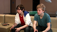 Здесь нет утренней побудки. Каждый встает по своему расписанию. У Саши каникулы. Вместе с другом — соседом по комнате — планирует, что будут делать сегодня. Обычно занятия самые разнообразные. Саша, Сережа: - Играем в теннис, смотрим телевизор, играем в компьютер ...